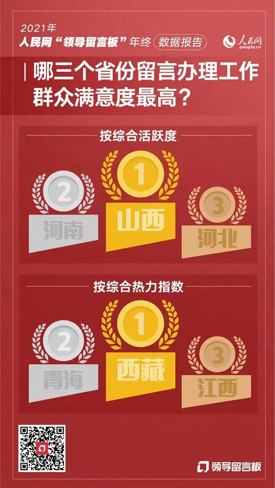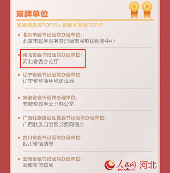 2021年,河北省委書記、省長留言版塊辦理單位雙雙入圍“2021年度人民網網上群眾工作民心匯聚單位”省級滿意度top15榜單。