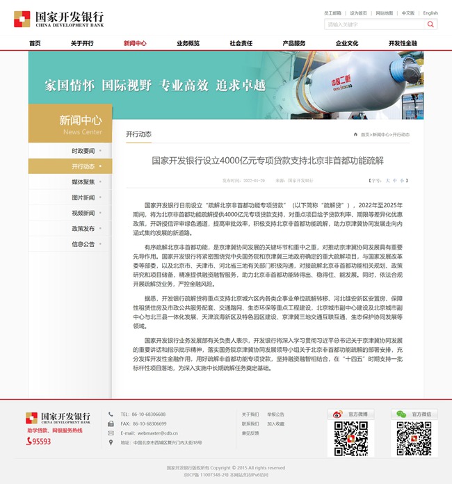 國家開發銀行業務發展部有關負責人表示,開發銀行將深入學習貫徹習近平總書記關于京津冀協同發展的重要講話和指示批示精神,落實國務院京津冀協同發展領導小組關于北京非首都功能疏解的部署安排,充分發揮開發性金融作用,用好疏解非首都功能專項貸款,堅持融資融智相結合,在“十四五”時期支持一批標桿性項目落地,為深入實施中長期疏解任務奠定基礎。