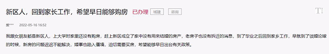 人民網雄安5月30日電 (李雪晴)“我跟女朋友都是新區人,上大學時家里還沒有購房,趕上新區設立了家中沒有用來結婚的房產,老房子也沒有拆遷的消息,到了畢業之后回到家鄉工作,早就到了談婚論嫁的時候,新房的問題遲遲不能解決,婚事也陷入僵境,迫切需要買房,希望能夠早日出臺有關政策。”日前,有網友在人民網“領導留言板”留言,稱因婚房問題導致結婚受阻,希望雄安新區早日出臺購房政策。