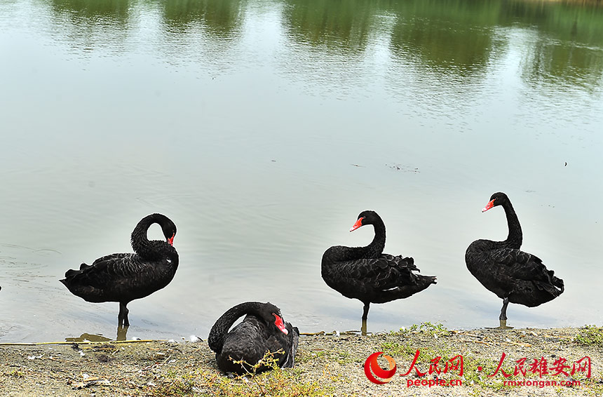 黑天鵝們在湖邊梳洗。劉向陽攝