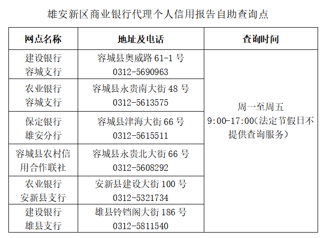 目前,雄安新區(qū)轄內(nèi)共設(shè)有6臺(tái)商業(yè)銀行代理個(gè)人信用報(bào)告自助查詢機(jī)。群眾可攜帶本人二代有效居民身份證就近前往辦理查詢服務(wù),取得與人民銀行版式相同的個(gè)人信用報(bào)告。