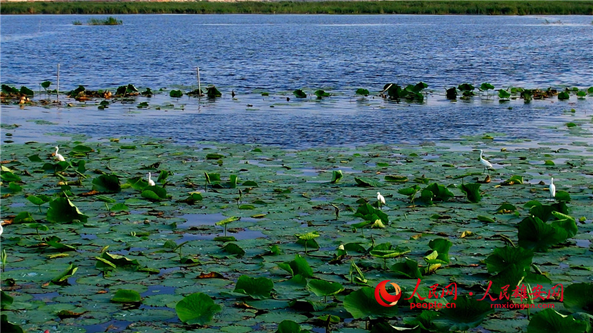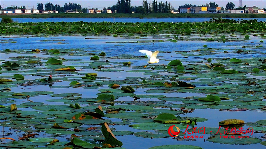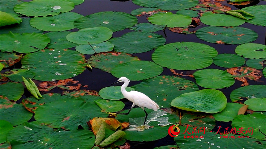 小白鷺在白洋淀的荷葉上棲息。高騰 攝