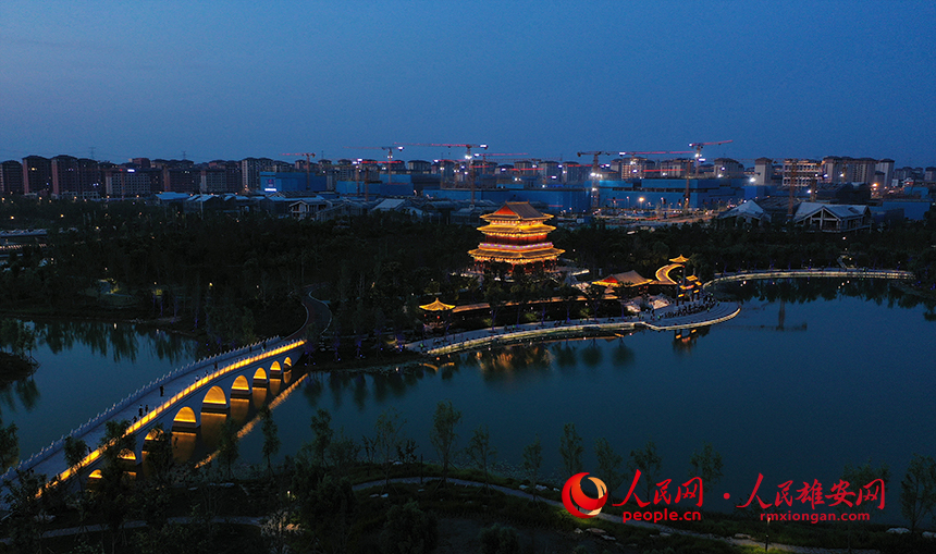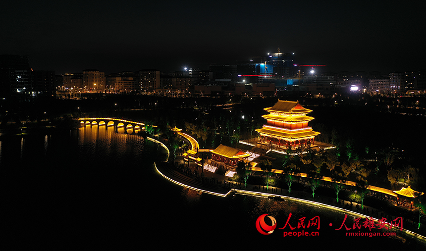 雄安金湖公園定安閣與迎曦橋(九孔橋)。人民網(wǎng)?李兆民攝