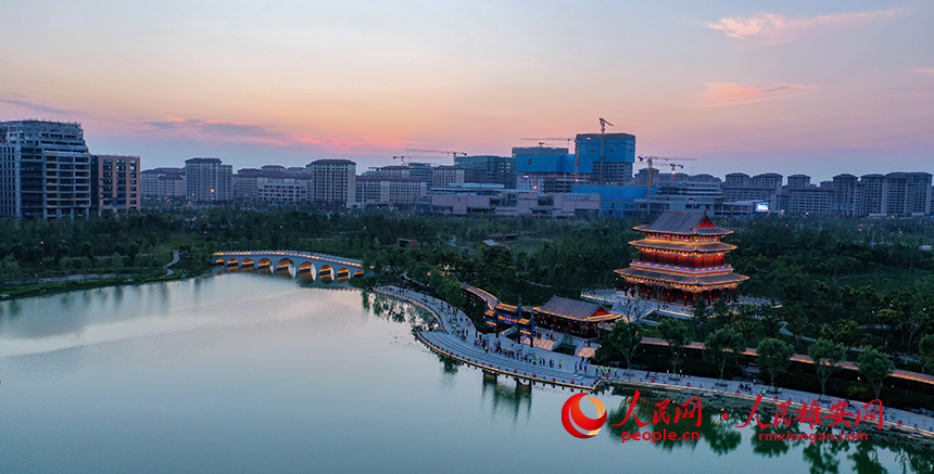 夕陽下的雄安金湖公園定安閣與迎曦橋(九孔橋)。人民網(wǎng)?李兆民攝