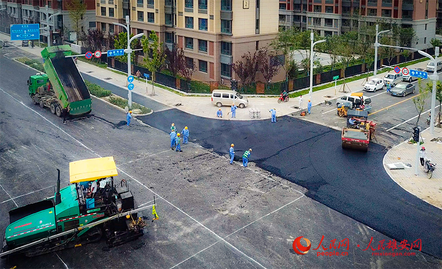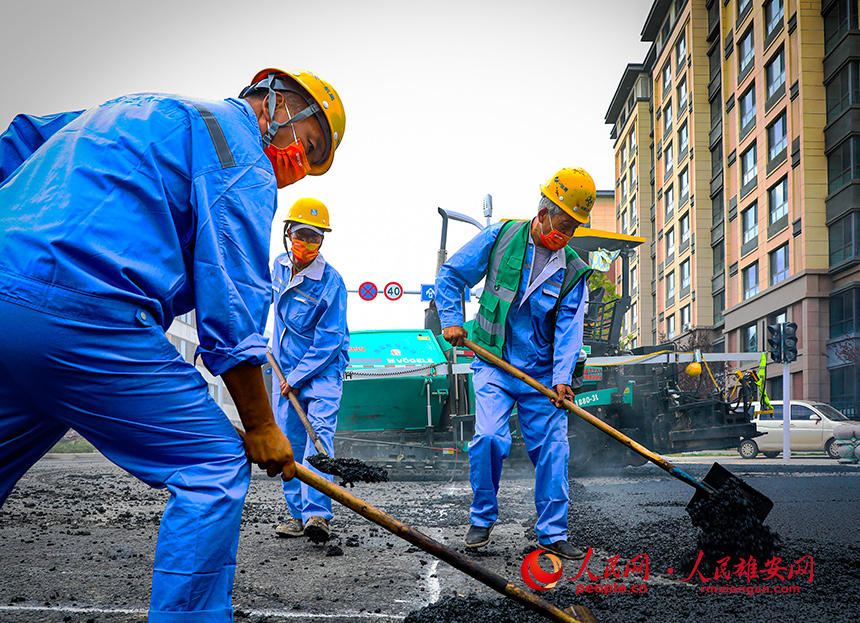 圖為工人正在進(jìn)行瀝青攤鋪。人民網(wǎng) 宋燁文攝