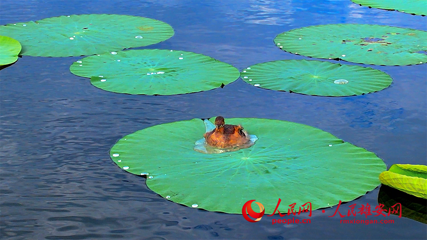 白洋淀里,在荷葉上休息的國家“三有”保護動物小鷿鷈。高騰攝