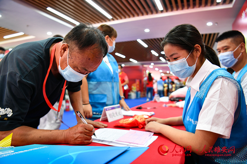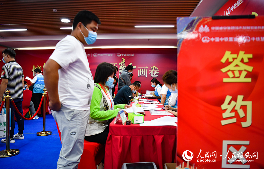 雄東第六交付點內,回遷居民正在有序簽約。人民網 宋燁文攝