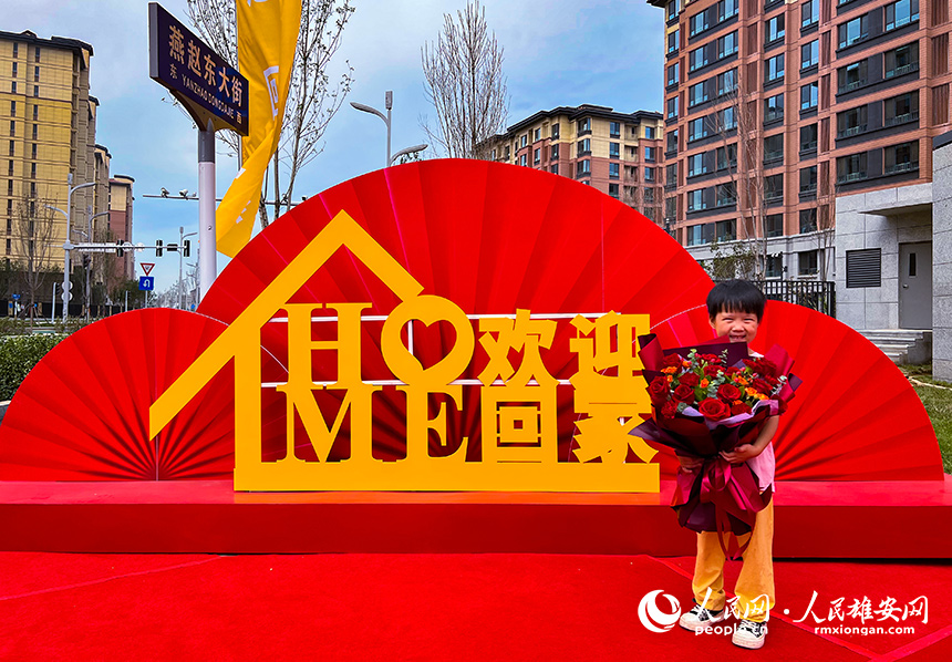 小朋友手捧鮮花在新家樓下拍照。雄縣融媒體中心供圖