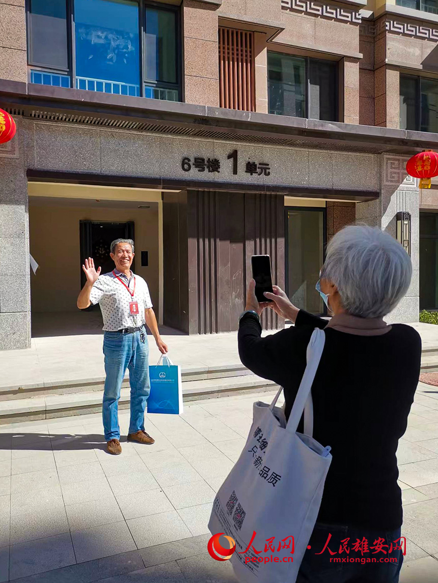 回遷居民在單元樓前拍照留念。雄安集團供圖