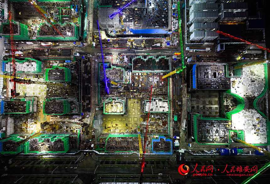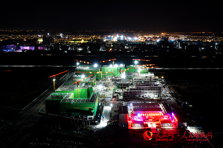 人民網雄安9月8日電?(宋燁文) 夜幕下的雄安啟動區,燈火璀璨,各項目建設現場仍有條不紊地進行施工建設。