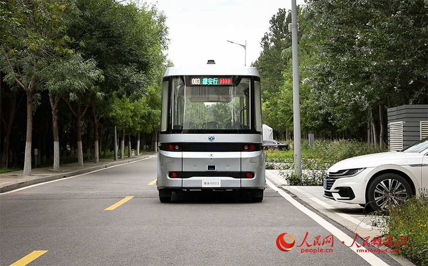 圖為運行在雄安市民服務中心的無人公交。據了解,雄安容東片區的無人公交擬于本月底正式測試實況路段。人民網 宋燁文攝
