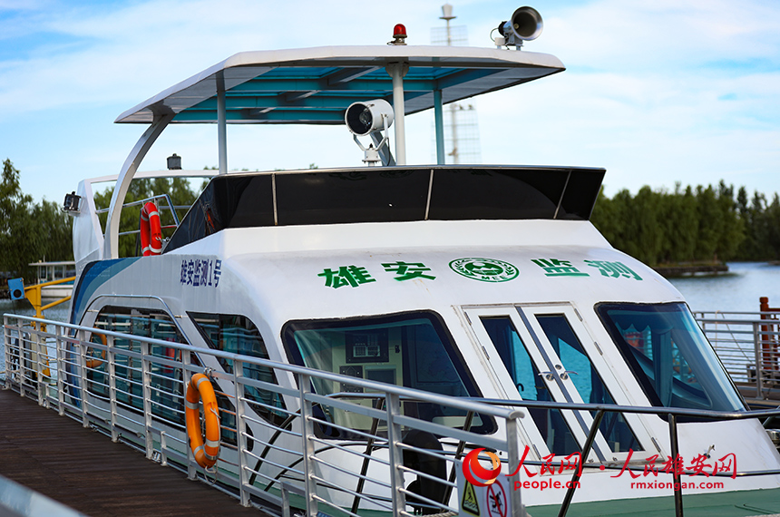 “天地一體化”生態監測的水上實驗室對白洋淀區水質進行日常監測。空中無人機監測,水中無人船采樣,采樣數據通過5G信號第一時間回傳。船上的水質監測設備能夠實現化學需氧量、氨氮、總磷、藻密度等14項水質指標的快速分析。圖為停泊在白洋淀水面上的“天地一體化”生態監測水上實驗室。人民網 宋燁文攝