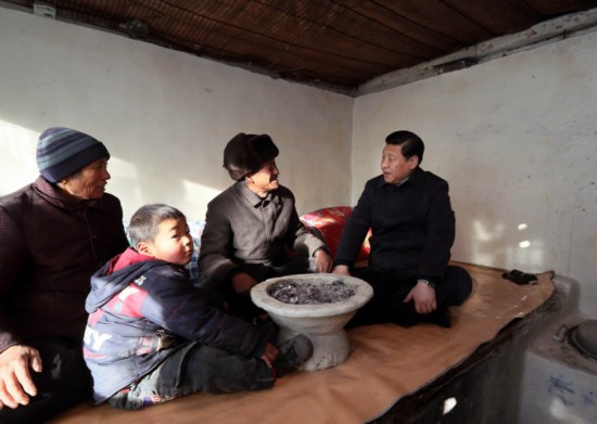 2012年12月29日至30日,中共中央總書記、中央軍委主席習近平在河北省阜平縣看望慰問困難群眾。這是習近平在龍泉關鎮駱駝灣村看望唐榮斌老人一家。新華社記者蘭紅光攝