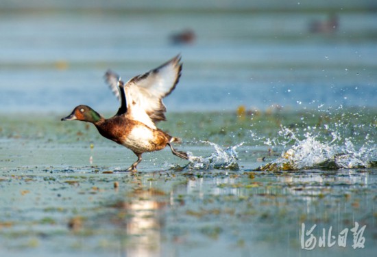 在白洋淀水域,國家一級保護動物青頭潛鴨在水面上奔跑。河北日報記者李東宇攝