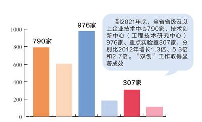 到2021年底,全省省級及以上企業技術中心790家、技術創新中心(工程技術研究中心)976家、重點實驗室307家,分別比2012年增長1.3倍、5.3倍和2.7倍。“雙創”工作取得顯著成效。到2021年底,全省孵化器數量達184家,其中,國家級43家;眾創空間332家,其中國家級106家。