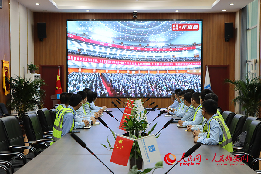 中建八局雄安·金湖未來(lái)城項(xiàng)目部集體收看中國(guó)共產(chǎn)黨第二十次全國(guó)代表大會(huì)開(kāi)幕會(huì)。中建八局供圖