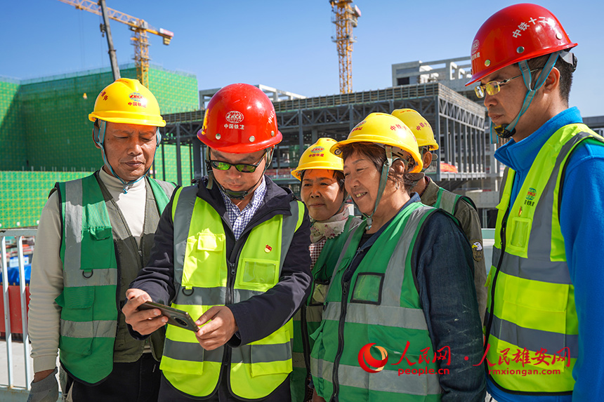 中鐵十二局雄安創新研究院科技園區項目建設現場,建設者們通過手機收看中國共產黨第二十次全國代表大會開幕會。任雙歡攝
