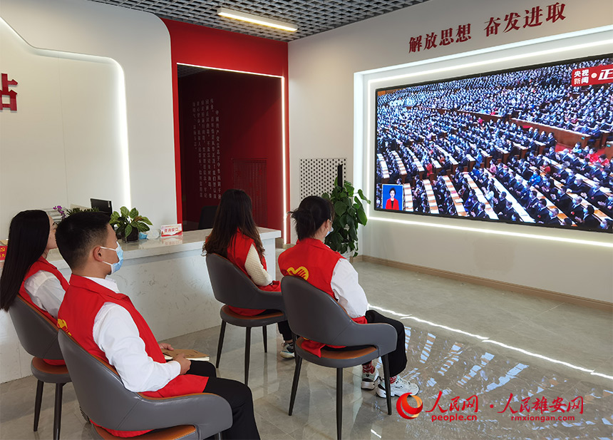 雄東片區(qū)社區(qū)工作人員集中收聽收看中國共產(chǎn)黨第二十次全國代表大會開幕會。昝崗管委會供圖
