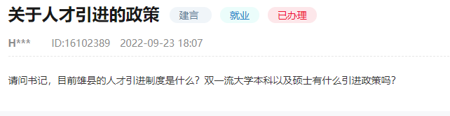 人民網(wǎng)雄安11月1日電 (王紅)“目前雄縣的人才引進制度是什么?‘雙一流’大學(xué)本科以及碩士有什么引進政策嗎?”近日,有網(wǎng)友在人民網(wǎng)“領(lǐng)導(dǎo)留言板”留言,詢問雄安新區(qū)雄縣人才引進相關(guān)政策。