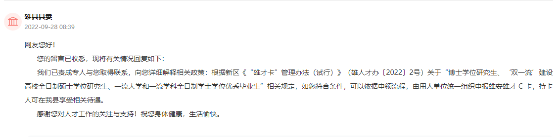 雄縣縣委在接到留言后表示,根據(jù)雄安新區(qū)《“雄才卡”管理辦法(試行)》(雄人才辦〔2022〕2號)關(guān)于“博士學(xué)位研究生、‘雙一流’建設(shè)高校全日制碩士學(xué)位研究生、一流大學(xué)和一流學(xué)科全日制學(xué)士學(xué)位優(yōu)秀畢業(yè)生”相關(guān)規(guī)定,該網(wǎng)友若符合條件,可以依據(jù)申領(lǐng)流程,由用人單位統(tǒng)一組織申報雄安雄才 C 卡,持卡人可在雄縣享受相關(guān)待遇。