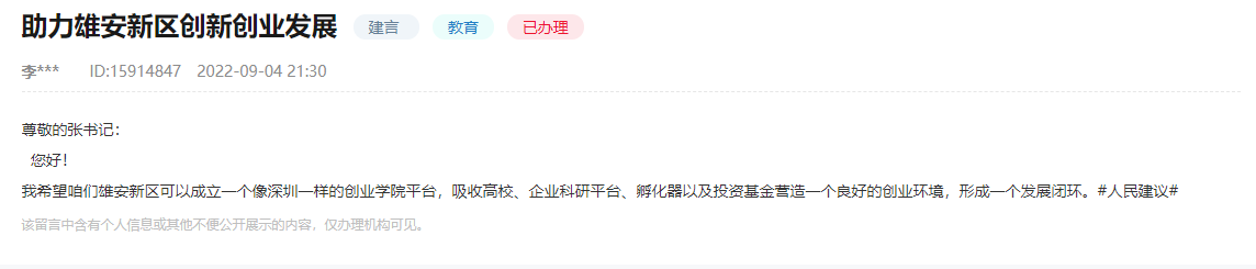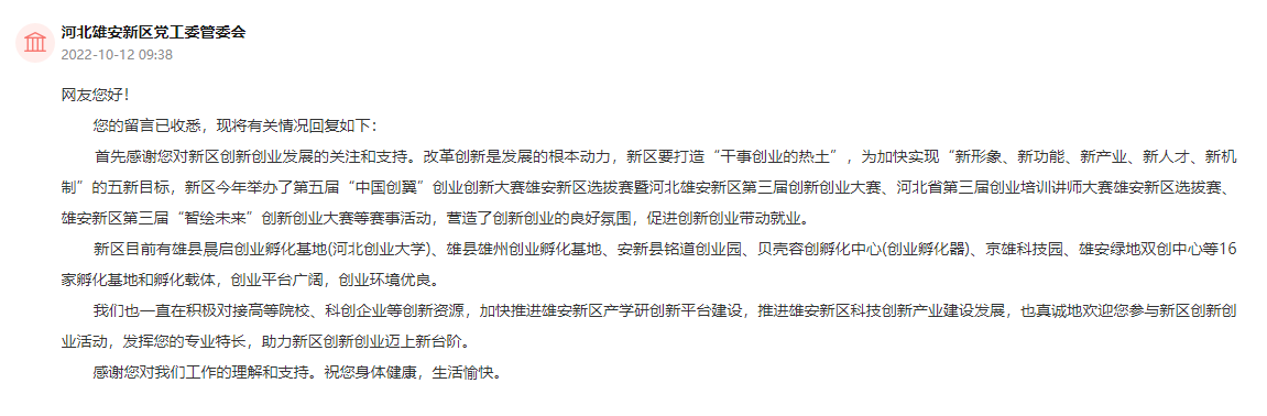 雄安新區黨工委管委會在留言回復中表示,真誠歡迎網友參與雄安新區創新創業活動,發揮專業特長,助力雄安新區創新創業邁上新臺階。