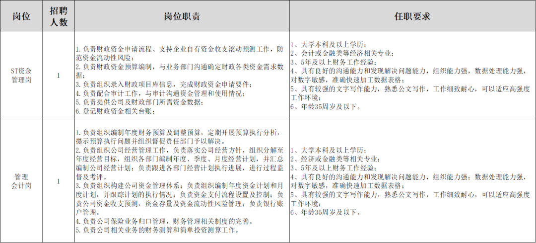 河北雄安人力資源服務有限公司(以下簡稱雄安人力公司)根據(jù)生態(tài)建設公司財務管理工作需要,現(xiàn)面向社會公開招聘資金管理崗和管理會計崗。本次招聘人員工作地點在雄安新區(qū),主要負責財政資金預算編制、申請、管理使用及年度財務預算編制、調(diào)整、預算執(zhí)行分析、資金計劃管理等相關工作。