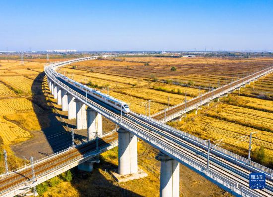 這是在天津北辰區拍攝的動車組列車行駛在京濱城際鐵路寶坻至北辰段(2022年11月4日攝,無人機照片)。新華社發(李佳駿 攝)