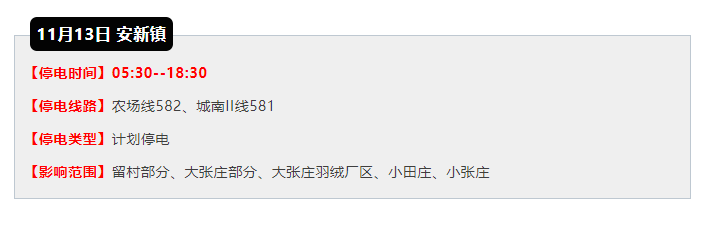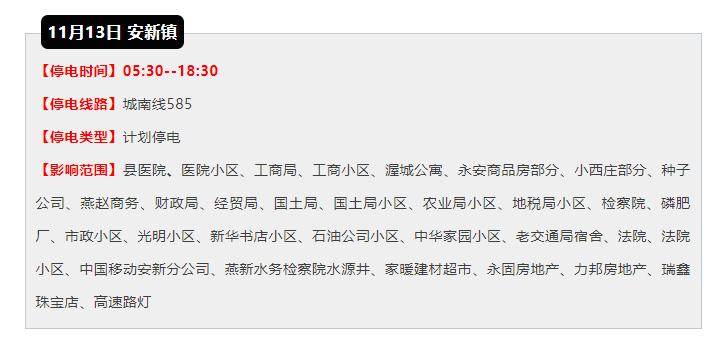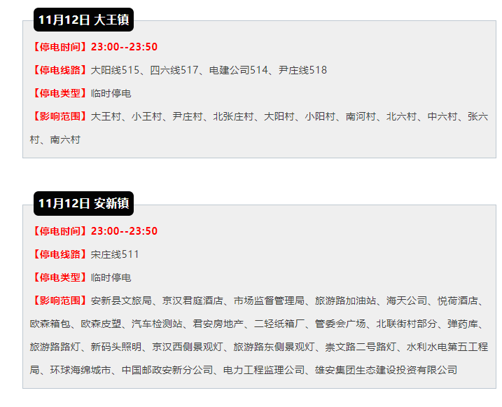 2、停電提醒:今明兩天,安新縣安新鎮、大王鎮、三臺鎮多地計劃停電。