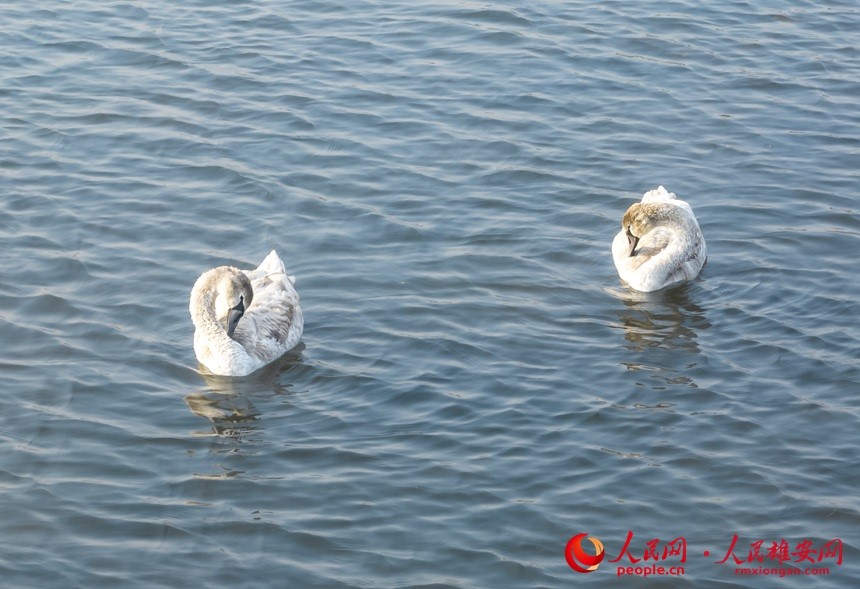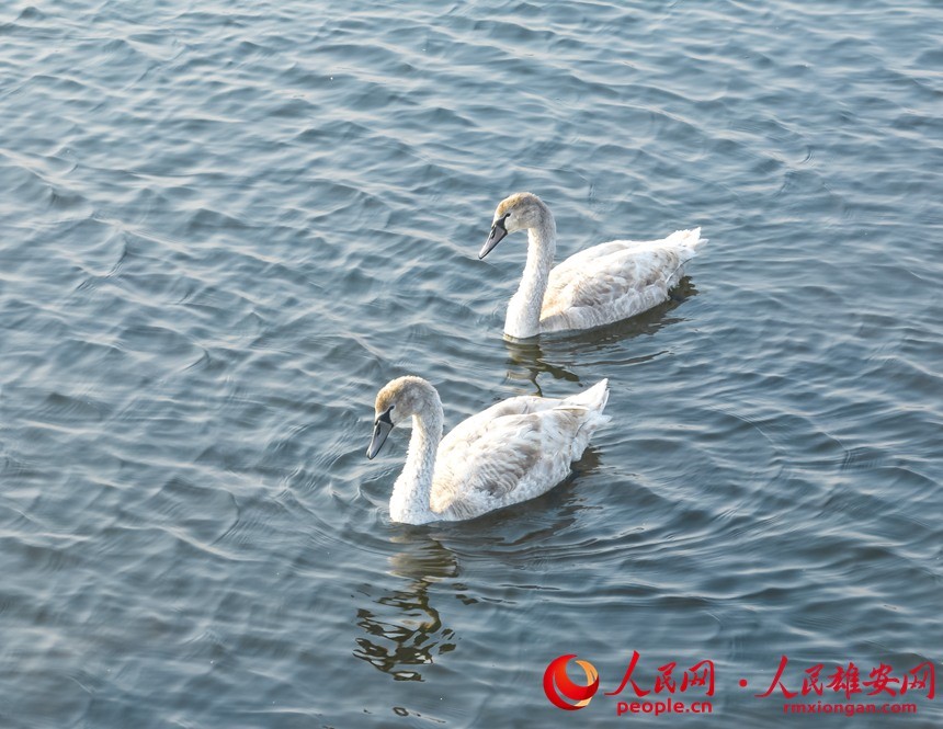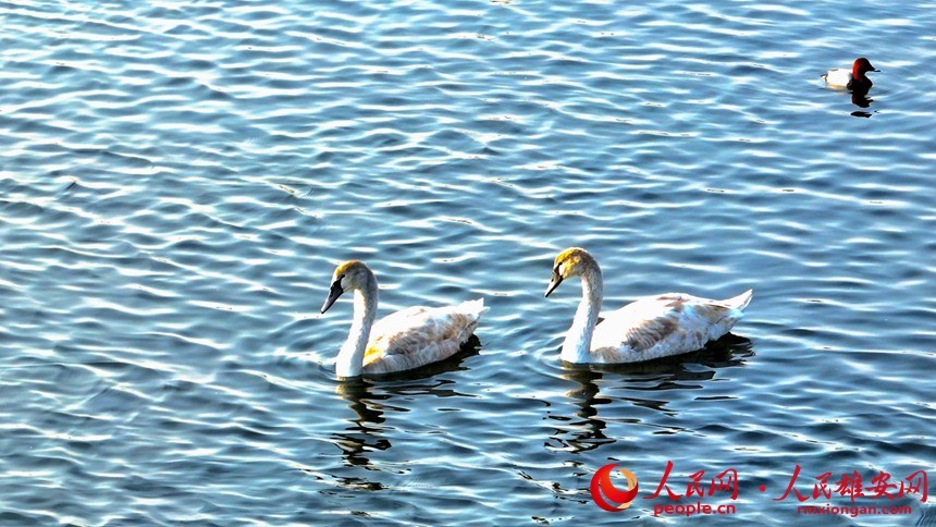 人民網(wǎng)雄安11月16日電 在雄安新區(qū)雄縣近日組織開展的野生鳥類監(jiān)測活動中,愛鳥護(hù)鳥志愿者在白洋淀監(jiān)測記錄到一對珍稀鳥類疣鼻天鵝在淀面上覓食游動的影像,甚是和諧優(yōu)美。