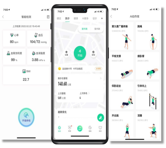 運動項目包括健走、跑步、騎行和AI健身運動(AI跳繩、AI開合跳、AI俯臥撐、AI平板支撐、AI仰臥起做、AI深蹲、AI弓箭步跳等)。