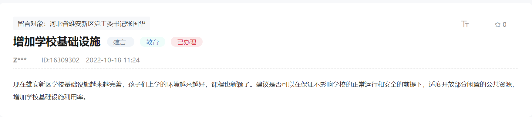 該網友在留言中稱,現在雄安新區中小學校的基礎設施越來越多越完善,很多新建學校配備的室外操場、風雨操場、多功能教室規格都很高,如果能夠適時適度面向社會公眾開放,對于豐富人民群眾文化生活大有裨益。