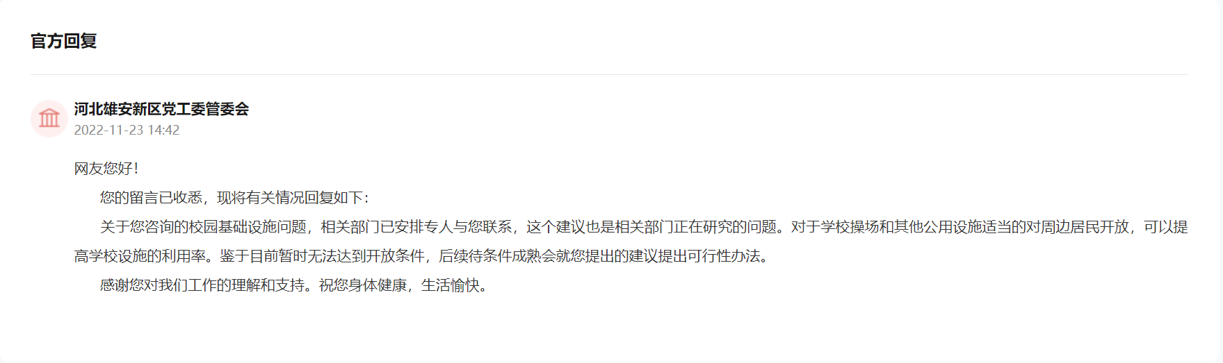 收到留言后,雄安新區黨工委管委會回復稱:網友的建言也是目前雄安新區相關部門正在研究的問題,對于學校操場和其他公用設施適當對周邊居民開放,可以提高學校設施的利用率。但鑒于目前暫時無法達到穩定的開放條件,后續待條件成熟會就該建議提出可行性辦法。