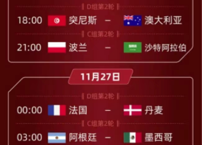 卡塔爾世界杯今日18:00將迎來D組第2輪突尼斯對(duì)陣澳大利亞的比賽,21:00將迎來C組第2輪波蘭對(duì)陣沙特阿拉伯的比賽;27日00:00將迎來D組第2輪法國對(duì)陣丹麥,03:00將迎來C組第2輪阿根廷對(duì)陣墨西哥的比賽。