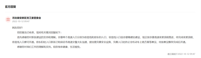 該網友稱,容東片區一年來已回遷三批居民,但對外出行不太方便。容東片區有2個京雄高速的出入口,目測早已完工,請領導督促相關部門盡快開放。