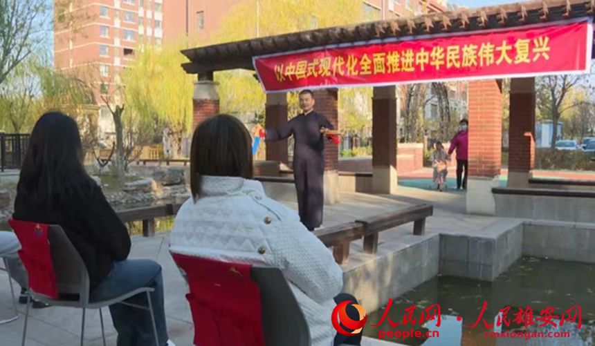 “講”——曲藝傳承人趙虎通過當地人喜歡的快板,把黨的二十大精神送到群眾身邊。趙虎說:“我是曲藝傳承人,我愿意發揮自己的特長,用‘鄉音’傳‘黨音’,力爭做一名合格的文藝宣講員。”安新縣融媒體中心供圖