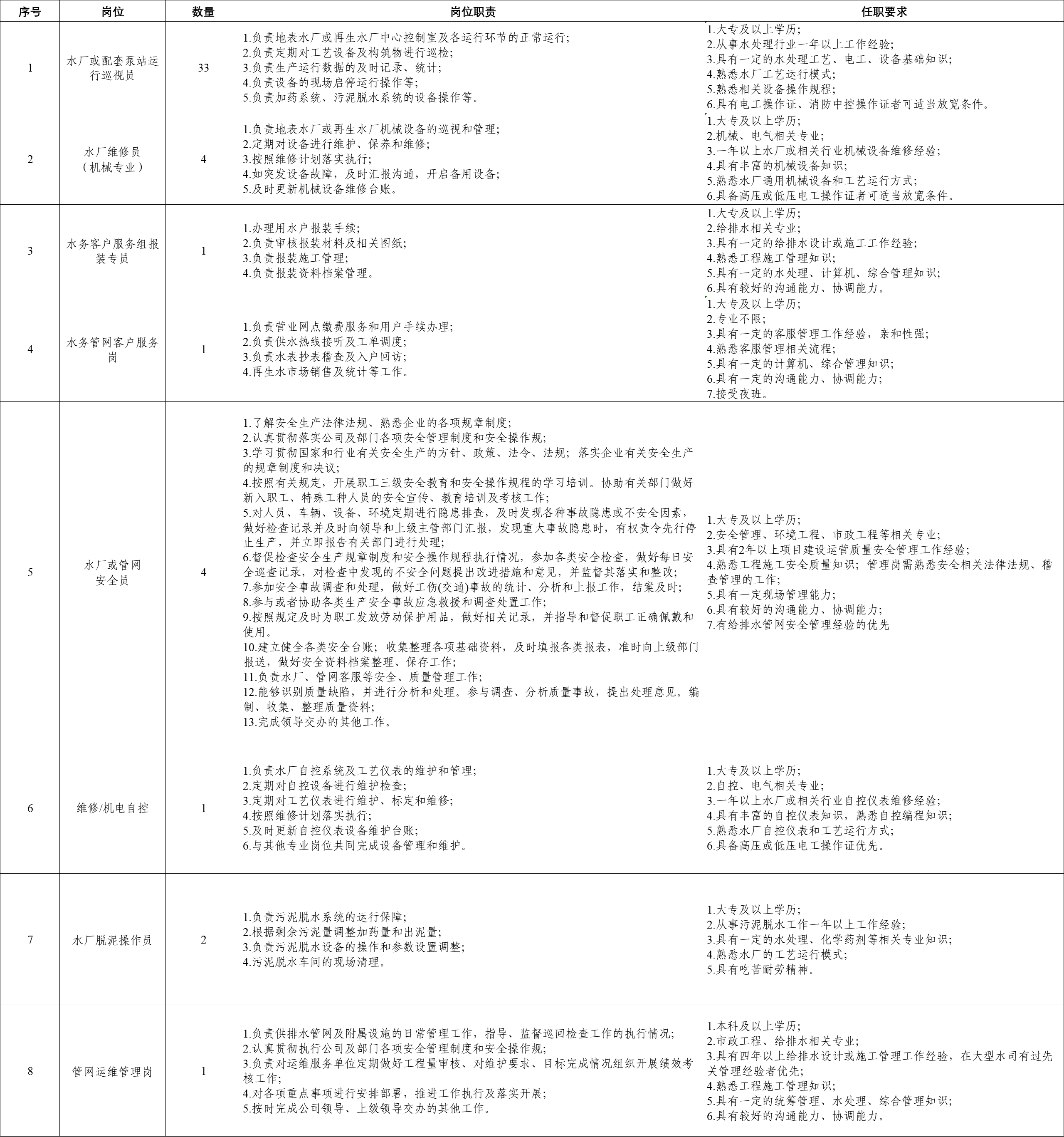 以下崗位入職人員將根據(jù)實(shí)際工作需要,安排至容東、容西、雄東、昝崗等片區(qū)水務(wù)運(yùn)營項(xiàng)目工作。