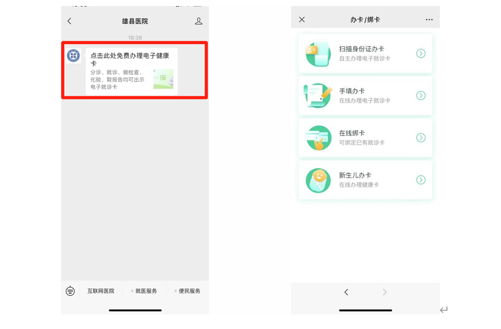 二、點擊公眾號內提醒消息,可通過多種方式辦理電子健康卡。無卡患者可掃描身份證或填寫就診人信息辦理電子健康卡;就診過的患者可綁定已有健康卡。