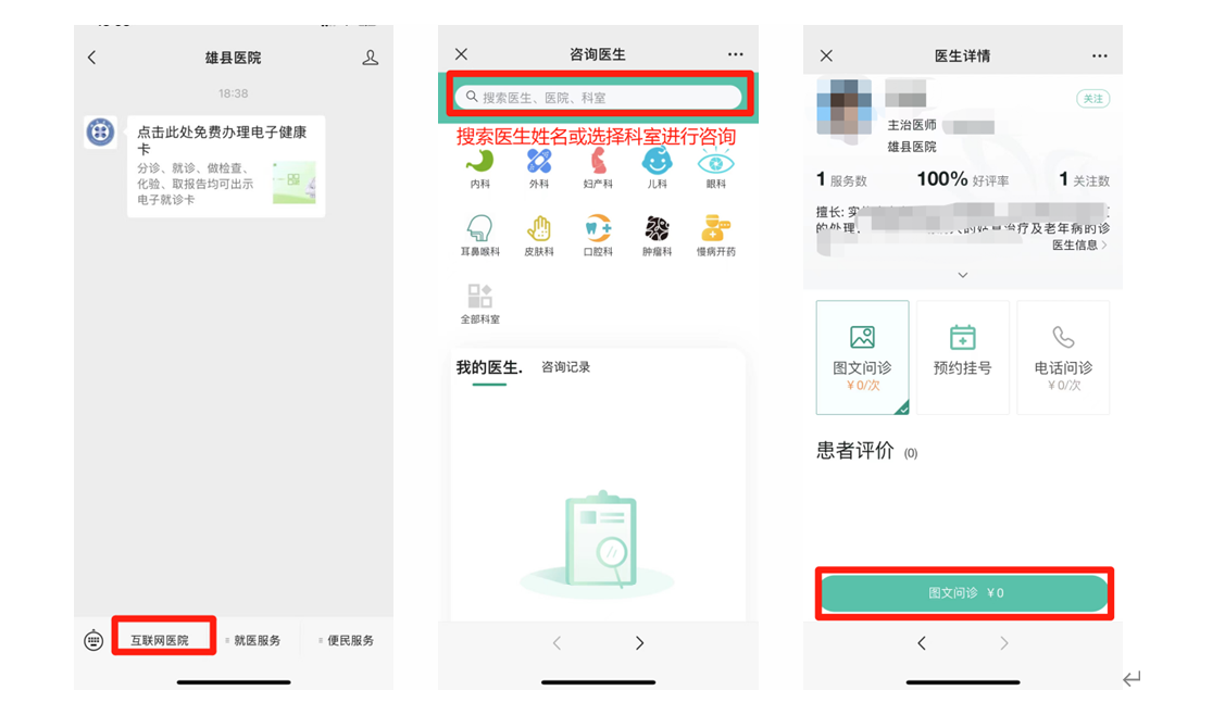 三、在公眾號內點擊“互聯網醫院”,進入線上問診平臺。選擇要咨詢的醫生,點擊“圖文問診”后選擇電子健康卡,描述詳細病情,進行在線問診。