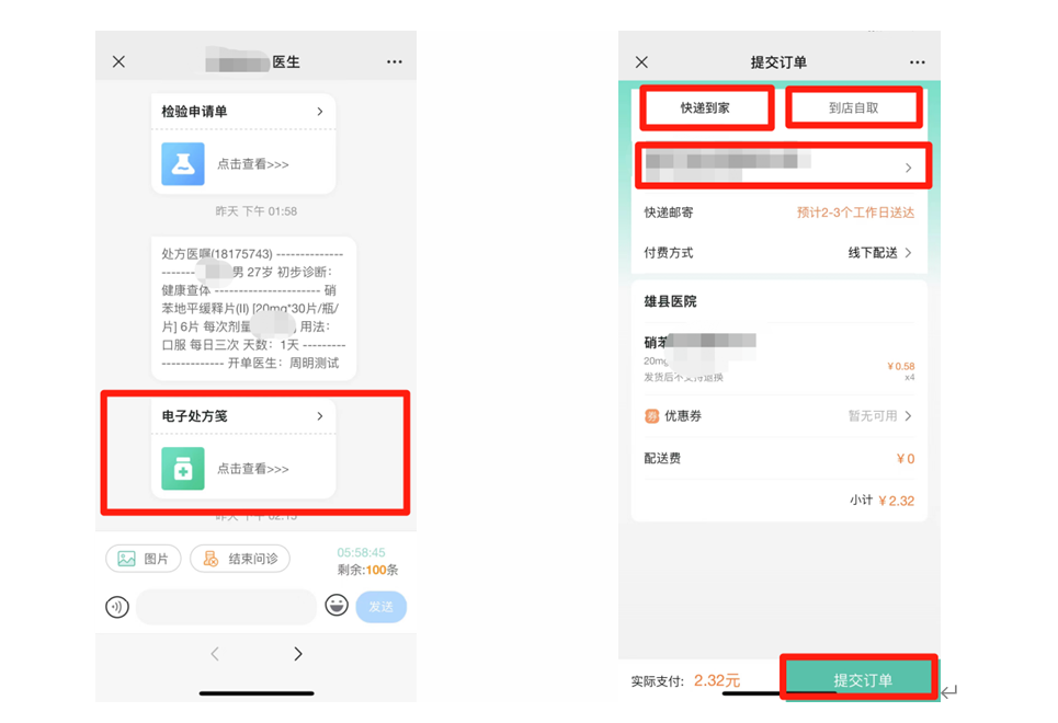 四、進入溝通頁面,醫生可在線開具檢查檢驗及處方,點擊待繳費提醒或檢查檢驗申請單、電子處方箋進行繳費,線上繳費后即可到院就醫或取藥。慢性病患者支付時可選擇快遞免費送藥到家的服務。