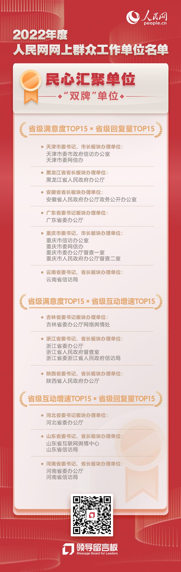 此次公布的名單綜合全國各地區各部門各單位近一年來的回復率、群眾滿意度等指數,著重突出各地區各單位各部門依托“領導留言板”開展網上群眾工作情況,篩選出2022年度人民網網上群眾工作“民心匯聚單位”“實干擔當單位”“匯智為民單位”,覆蓋中央部委有關部門、各地職能單位、各地留言辦理單位,共計598家。