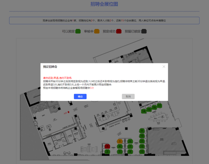 四、【招聘會(huì)】-【近期招聘會(huì)】頁(yè)面,點(diǎn)擊【我要參會(huì)】,跳轉(zhuǎn)到現(xiàn)場(chǎng)招聘會(huì)【在線預(yù)定】頁(yè)面,點(diǎn)擊綠色的展位,預(yù)約參會(huì)。頁(yè)面出現(xiàn)“預(yù)定招聘會(huì)”彈窗,點(diǎn)擊【確定】。