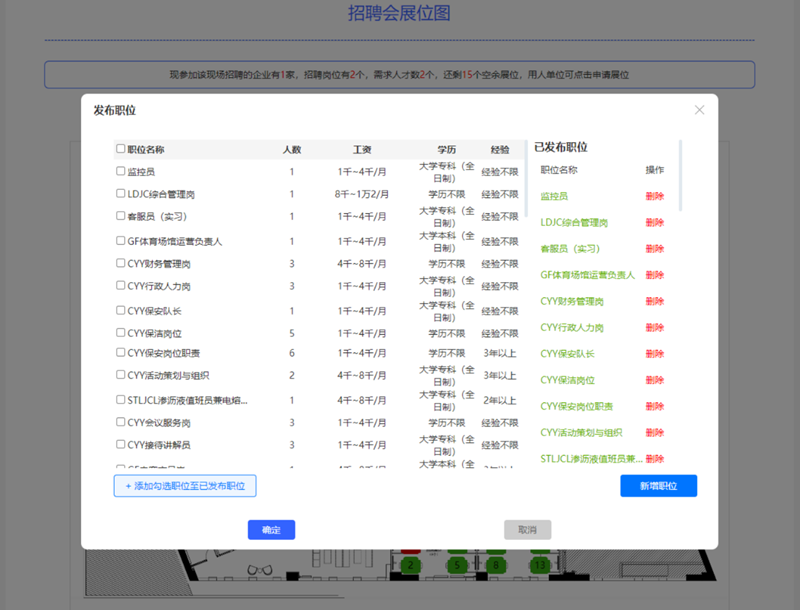 五、點(diǎn)擊【確定】后,頁(yè)面出現(xiàn)“分布職位”窗口,用戶可以在該窗口對(duì)招聘會(huì)分布的職位進(jìn)行增刪查改。