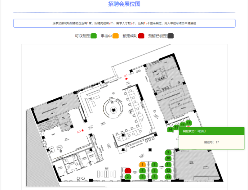 六、完成預(yù)約后,進(jìn)入現(xiàn)場(chǎng)招聘會(huì)【在線預(yù)定】頁(yè)面,橘黃色的展位表示預(yù)約正在審核中,展位狀態(tài)從橘黃色變?yōu)榧t色表示預(yù)約審核通過(guò)。