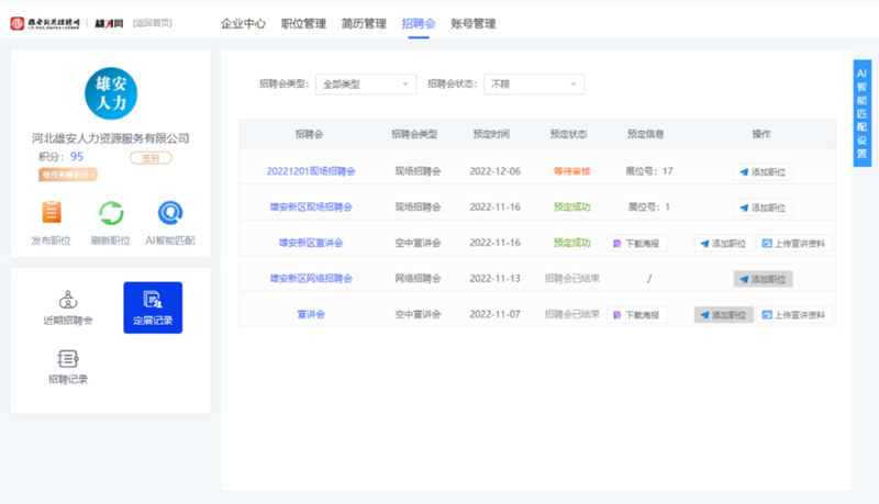 七、【招聘會(huì)】-【定展記錄】頁(yè)面,查看預(yù)約展位記錄和預(yù)定狀態(tài),也可以點(diǎn)擊【添加職位】按鈕對(duì)分布的職位進(jìn)行增刪查改。