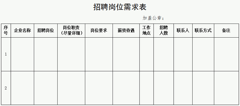 同時(shí)企業(yè)方需將營(yíng)業(yè)執(zhí)照復(fù)印件以及加蓋公章的招聘崗位需求表提交至雄安人力資源產(chǎn)業(yè)園2層人力資源市場(chǎng)窗口處。(附件2)。咨詢電話:張老師(13730275800)、趙老師(18232676055) 。