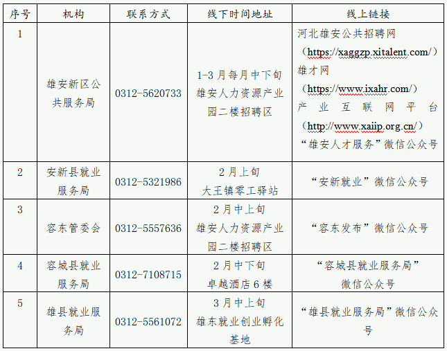 4.開(kāi)展線下招聘會(huì)。統(tǒng)一使用“2023年春風(fēng)行動(dòng)暨就業(yè)援助月專場(chǎng)招聘”名稱,舉辦分行業(yè)、分領(lǐng)域、高頻次、小規(guī)模專場(chǎng)招聘活動(dòng)。結(jié)合疫情防控要求,適時(shí)啟動(dòng)線下招聘活動(dòng)。企業(yè)方可登錄河北雄安公共招聘網(wǎng)(https://xaggzp.xitalent.com/),注冊(cè)賬號(hào)完善企業(yè)及崗位信息,并且預(yù)約招聘展位(附件1)。