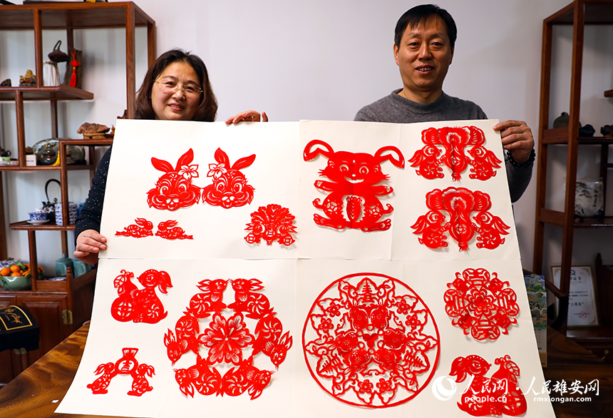 王愛和愛人一起展示已完成的“兔紙”。人民網(wǎng)?宋燁文攝