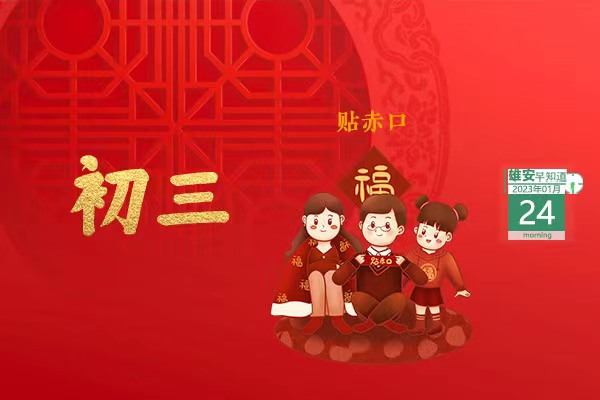 今天是2023年1月24日,星期二,天氣晴 ,-17℃~-5℃。今天是正月初三,按習(xí)俗,在這天要選一張約長(zhǎng)七八寸、寬一寸的紅紙條寫上吉祥話貼在門前的門頂上以求招財(cái)進(jìn)寶,萬(wàn)事如意。
