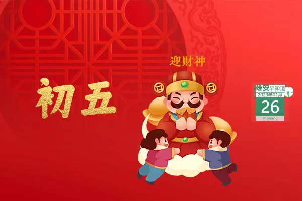今天是2023年1月26日,星期四,天氣多云,-14℃~0℃。今天是大年初五,俗稱“破五”,這天也是“財(cái)神爺生日”,因而迎財(cái)神成了民間的重要習(xí)俗。
