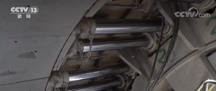 北京大興機場至雄安新區快線一標段三分部生產經理 鄧友濤:銀亮色的就是盾構機往前運行的動力,就是千斤頂、推進千斤頂,一共有22組。千斤頂撐在管片上,推著整個1200噸的盾構機往前運行。